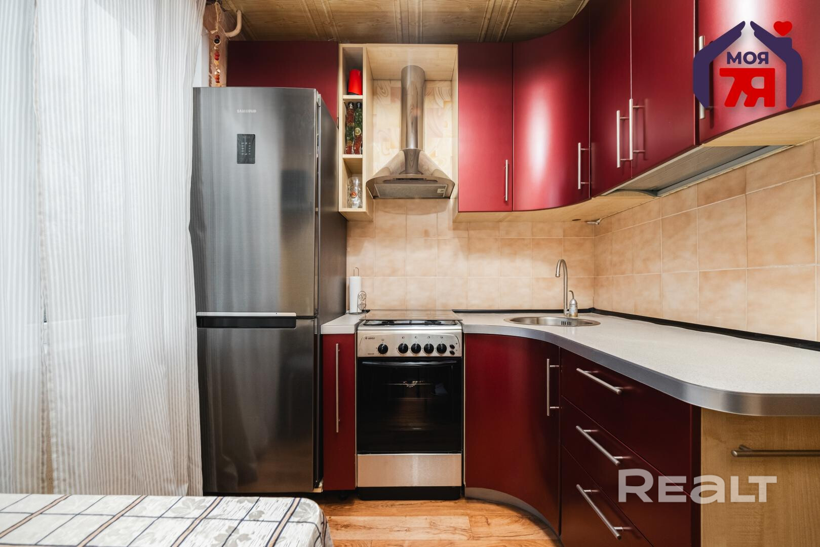 - Кухня в хорошем состоянии - чистая, функциональная, с новой плитой и достаточным местом для хранения и приготовления вкусных блюд.