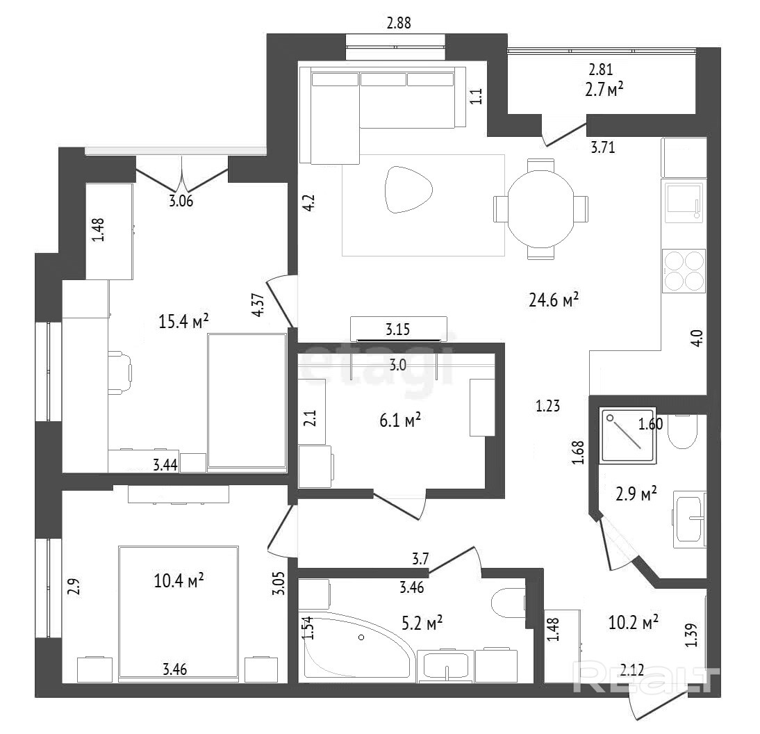 - 2 самостоятельных полнофункциональных с/у: один с/у с большой ванной, инсталляцией, умывальником и стиральной машиной, второй – с душевой, инсталляцией и умывальником;