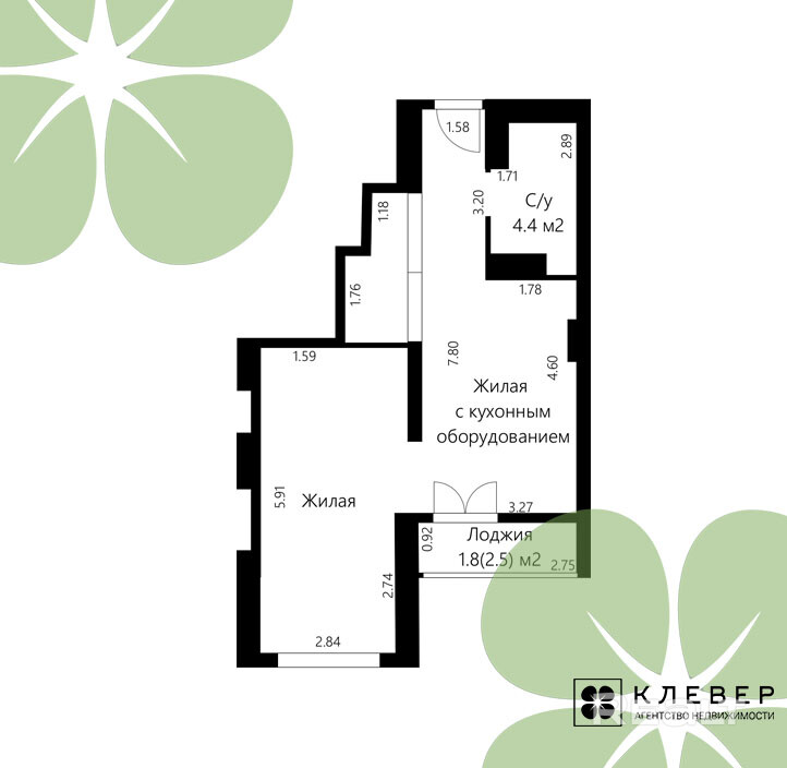 Жилая площадь 39.4 м2