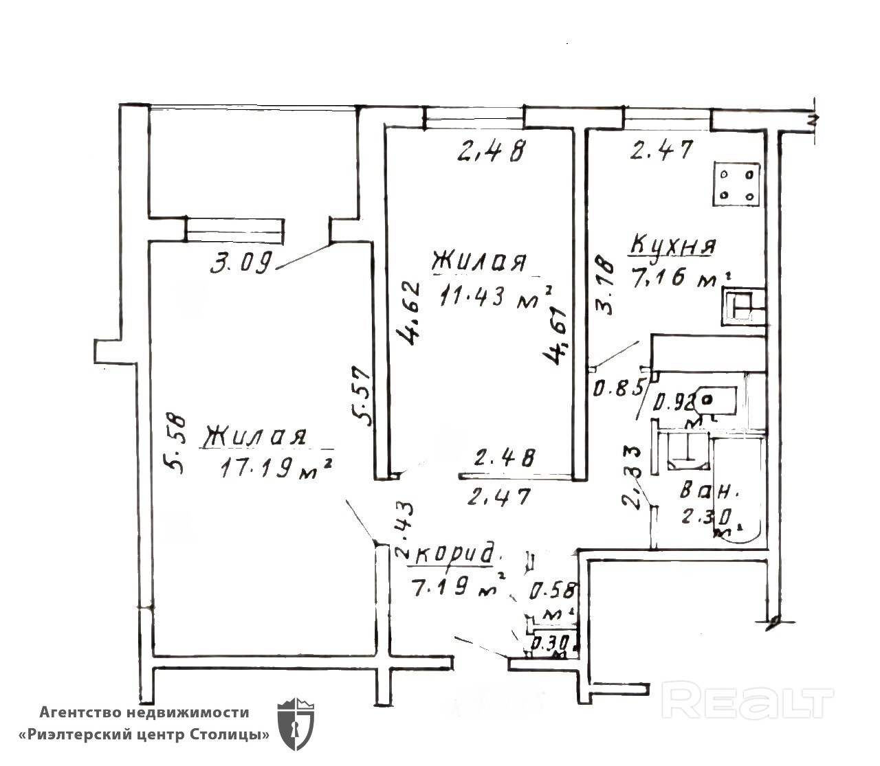 Квартира 47 кв.м., две просторные жилые комнаты, раздельный санузел, кухня 7 кв.м., пластиковые окна.