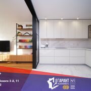 Просторная гостиная объединена с кухней, что создает ощущение простора и свободы, но при этом оборудована стеклянной раздвижной перегородкой, которая не утяжеляет пространство, но при этом даёт возможность для уединения.