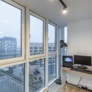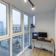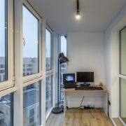 Огромная лоджия с теплым полом — идеально под подходит под рабочий кабинет или зону отдыха.