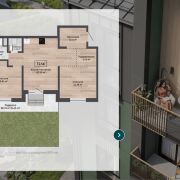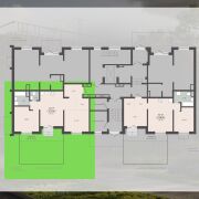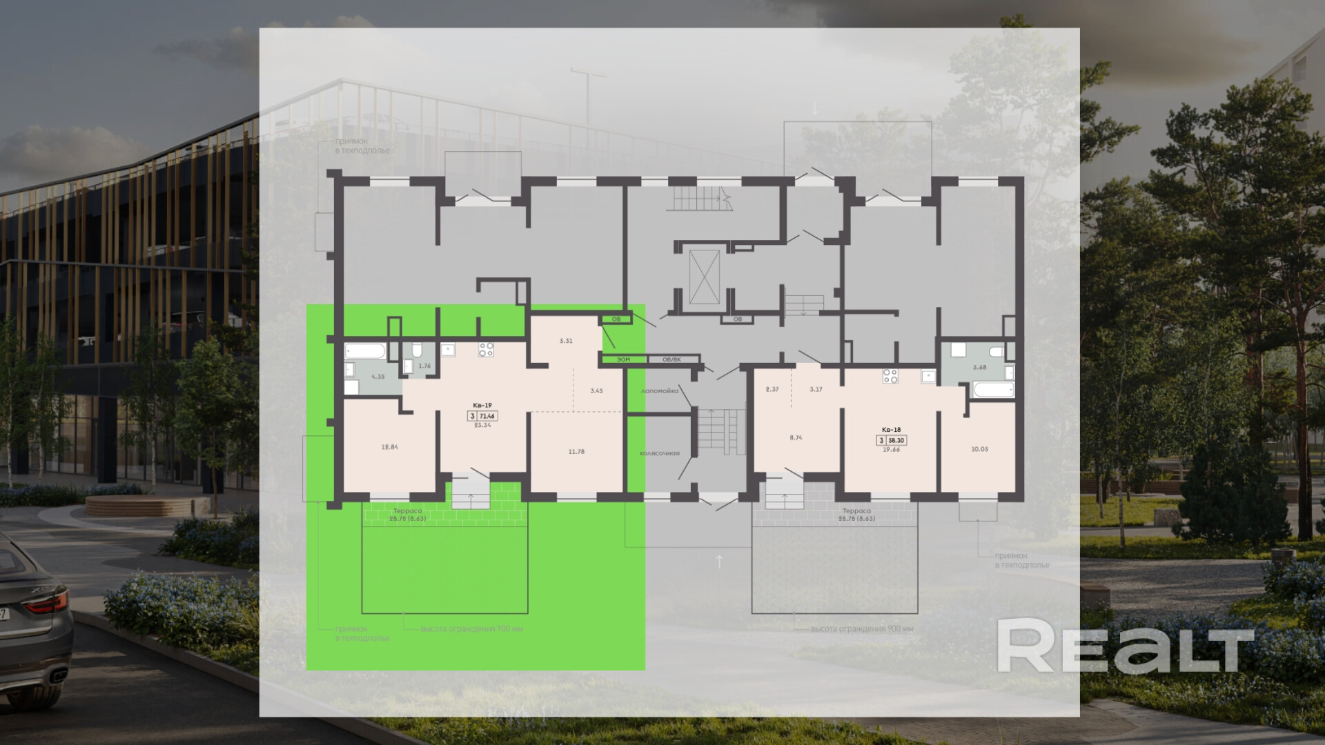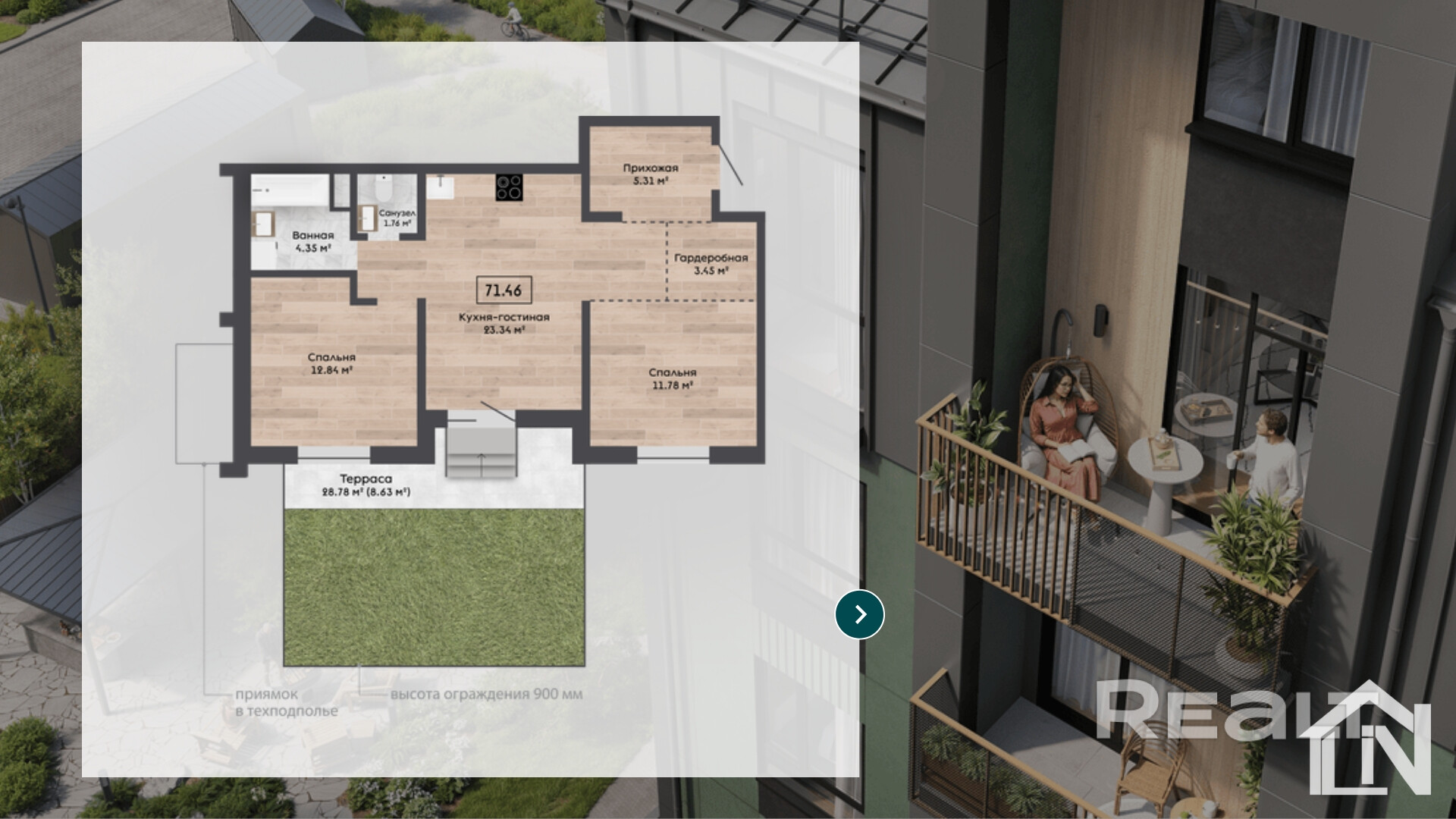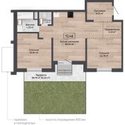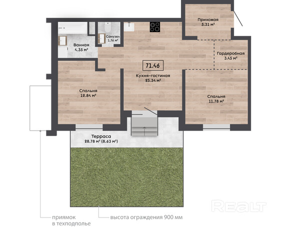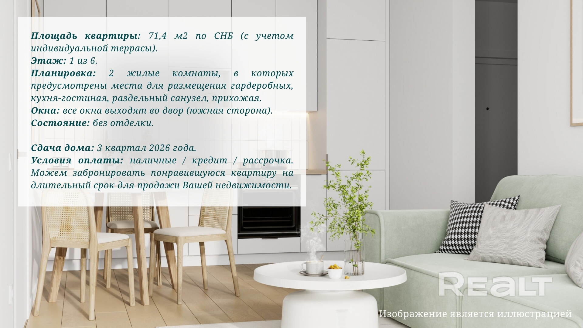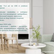 Метраж: 71,46 м2 — по СНБ (с учетом индивидуальной террасы); 62,8 м2 — общий; 48 м2 — жилой + площадь террасы 8,63 м2 с учетом понижающего коэффициента (без него цифра больше).