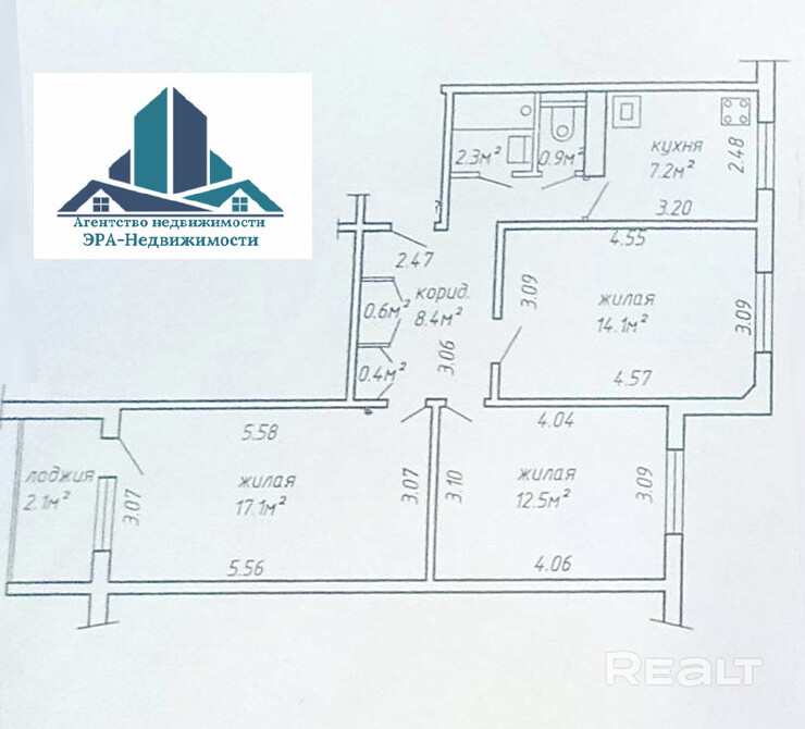 3 изолированные комнаты: 17.1 кв.м., 12.5 кв.м., 14.1 кв.м.