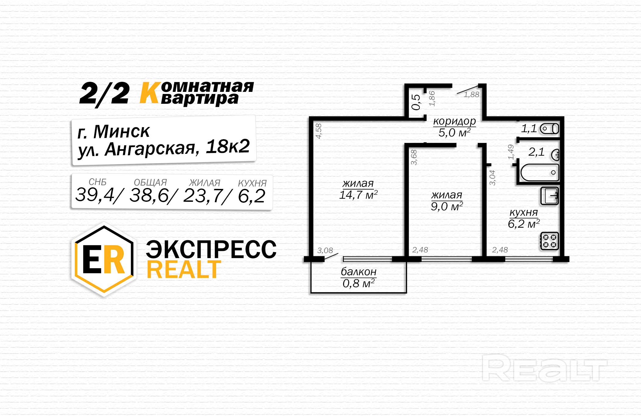 - Площадь: 38,6 м2 (по СНБ 39,4 м2)