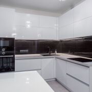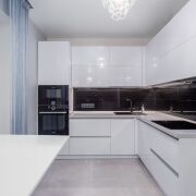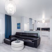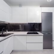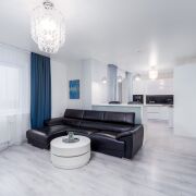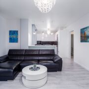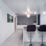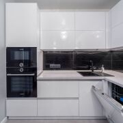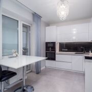 • Большая кухня-гостиная — стильное пространство для семьи и гостей. Современная кухня с белыми фасадами, качественной фурнитурой, продуманным хранением и встроенной техникой Bosch: посудомойка, варочная поверхность, духовой шкаф, микроволновка. Имеется кондиционер, который спасет вас от летней жары.
