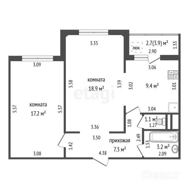 2 изолированные комнаты: 17,2 м2 и 18,9 м2