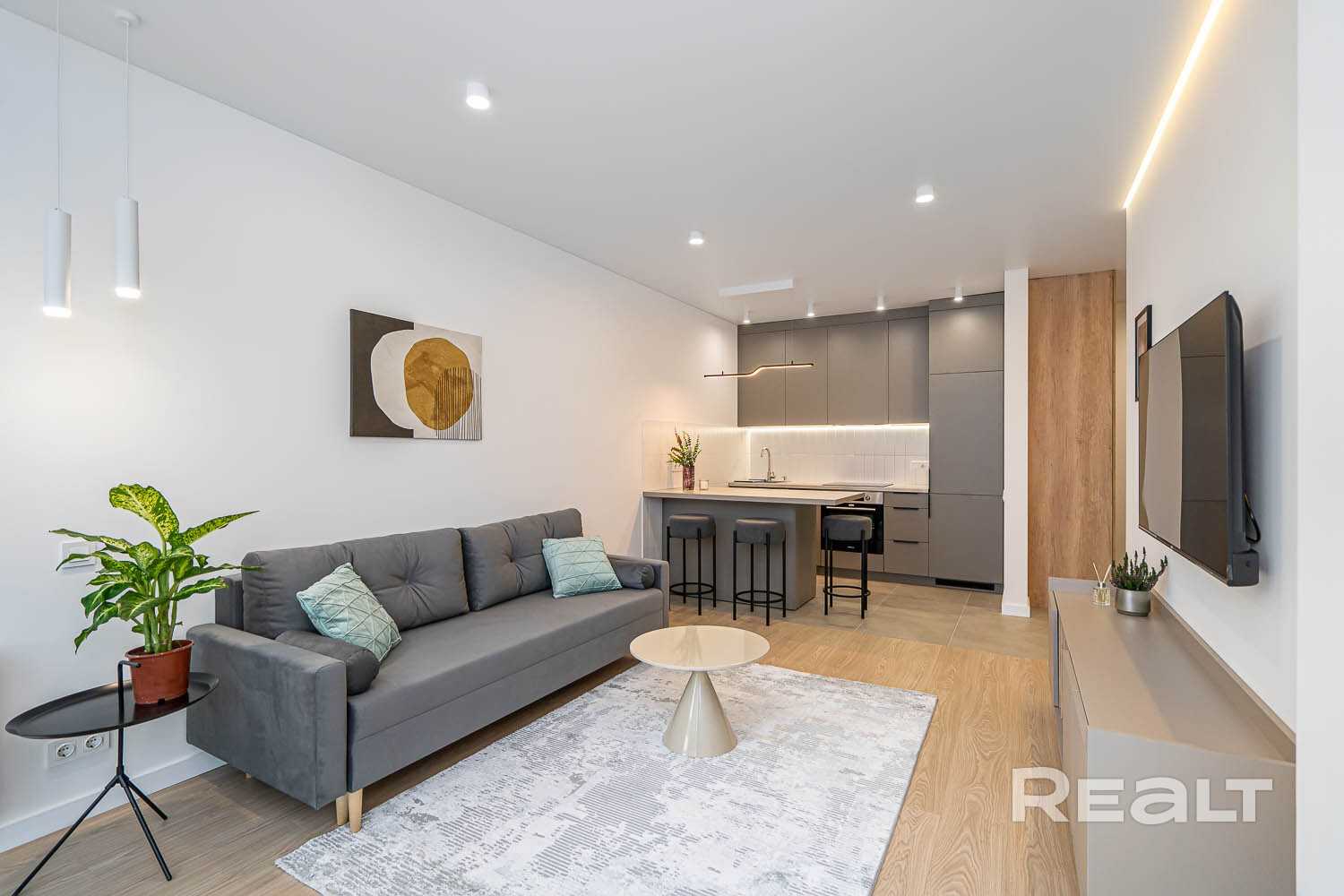 + удобная кухня-гостиная со всей необходимой техникой (посудомоечная машина и встроенный холодильник, духовой шкаф и варочная поверхность, телевизор) и более чем достаточным количеством мест для хранения;
