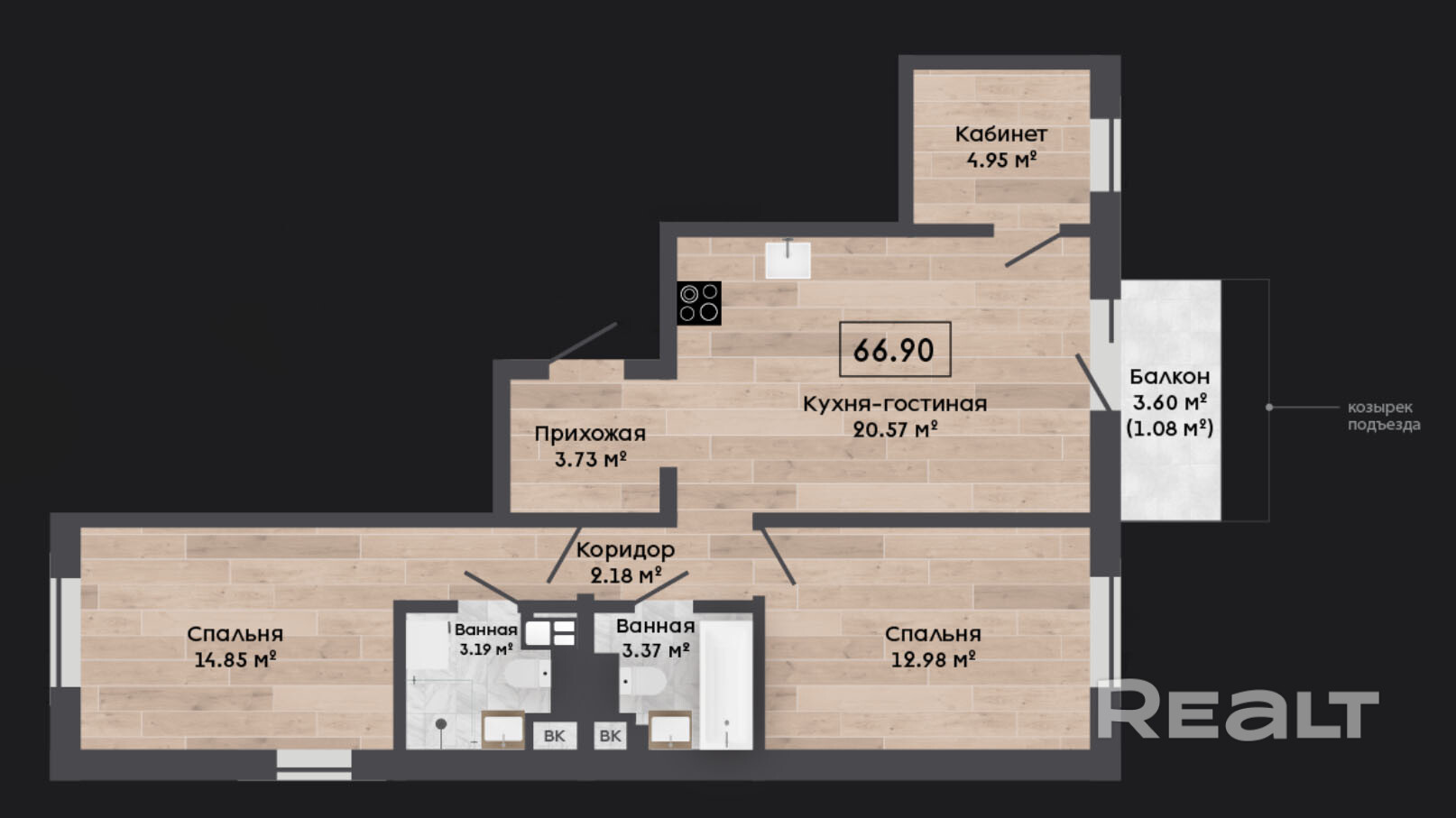 Отделка санузла -выполняется полная отделка санузла, укладка плитки (Вы можете выбрать из 3 вариантов коллекции плитки), установка сантехники, монтаж розеток.