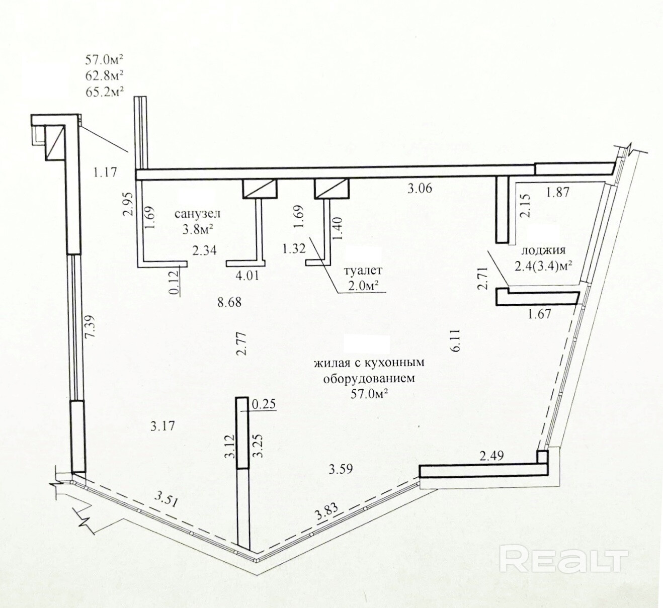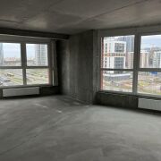 Отличная планировка квартиры! Площадь по СНБ 65.2 кв м, можно легко распланировать на 3 комнаты. Большие панорамные окна добавляют много света. Выполнена черновая отделка.