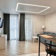 Ремонт делался для собственного проживания из дорогостоящих материалов: на полу в спальной зоне уложен ламинат, в кухонной и санузле - керамогранит, в комнате стены отделаны венецианской штукатуркой, в санузле - керамической плиткой, установлены натяжные потолки с парящими линиями.