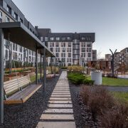 · Двор: закрытый стилобат с уютным двором-парком: детские площадки, беседки, зелёные зоны и даже мини-огороды.