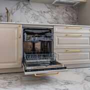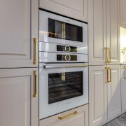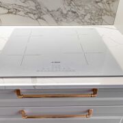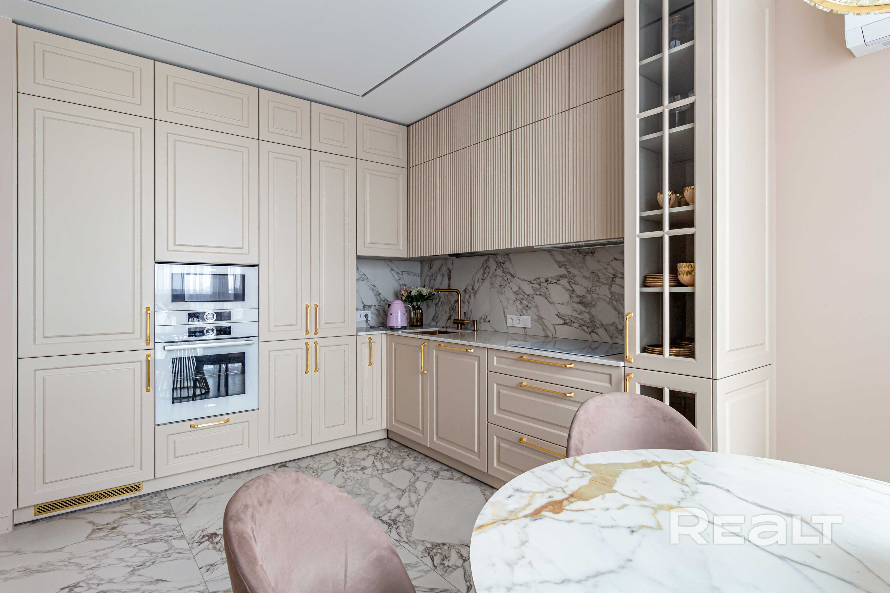 Кухня оснащена современной техникой : духовой шкаф, варочная панель и микроволновая печь, посудомоечная машина от производителя Bosch.