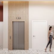 Далее – лифтовый холл. Cкоростных малошумных лифтов не один, а два, что вполне достаточно для 12-этажного здания. Один — для пассажиров и грузов, а второй — статусный, роскошный! — панорамный лифт.
