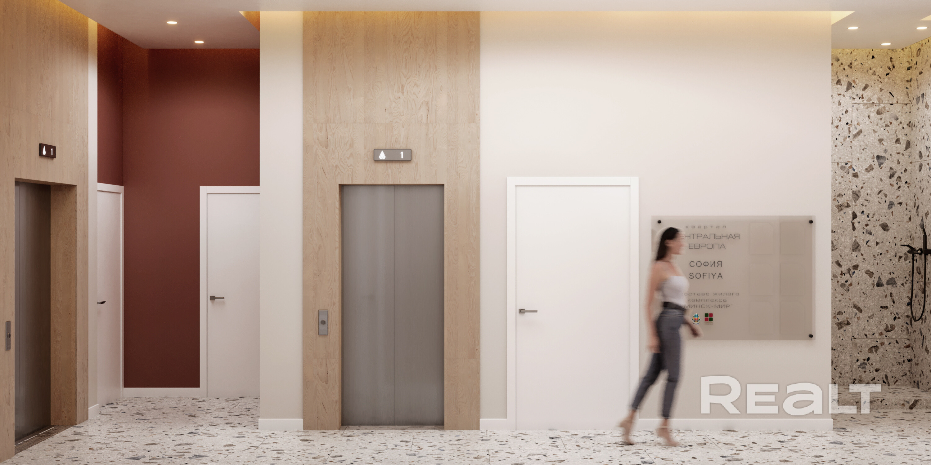 В доме "София"роскошное дизайнерское лобби, которое напоминает вестибюли дорогих отелей. Высота потолков здесь достигает 3,9 м. Площадь лобби составляет 61,8 «квадрата». Есть ресепшн. Это рабочее место консьержа — специалиста, следящего за порядком. Для комфорта родителей обустроена туалетная комната с пеленальным столиком для малышей.