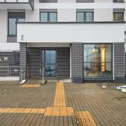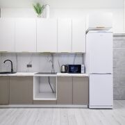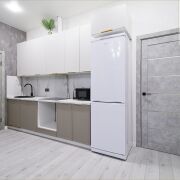 - Кухня с современной мебелью, встроенной варочной панелью, микроволновкой, холодильником