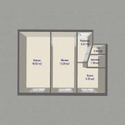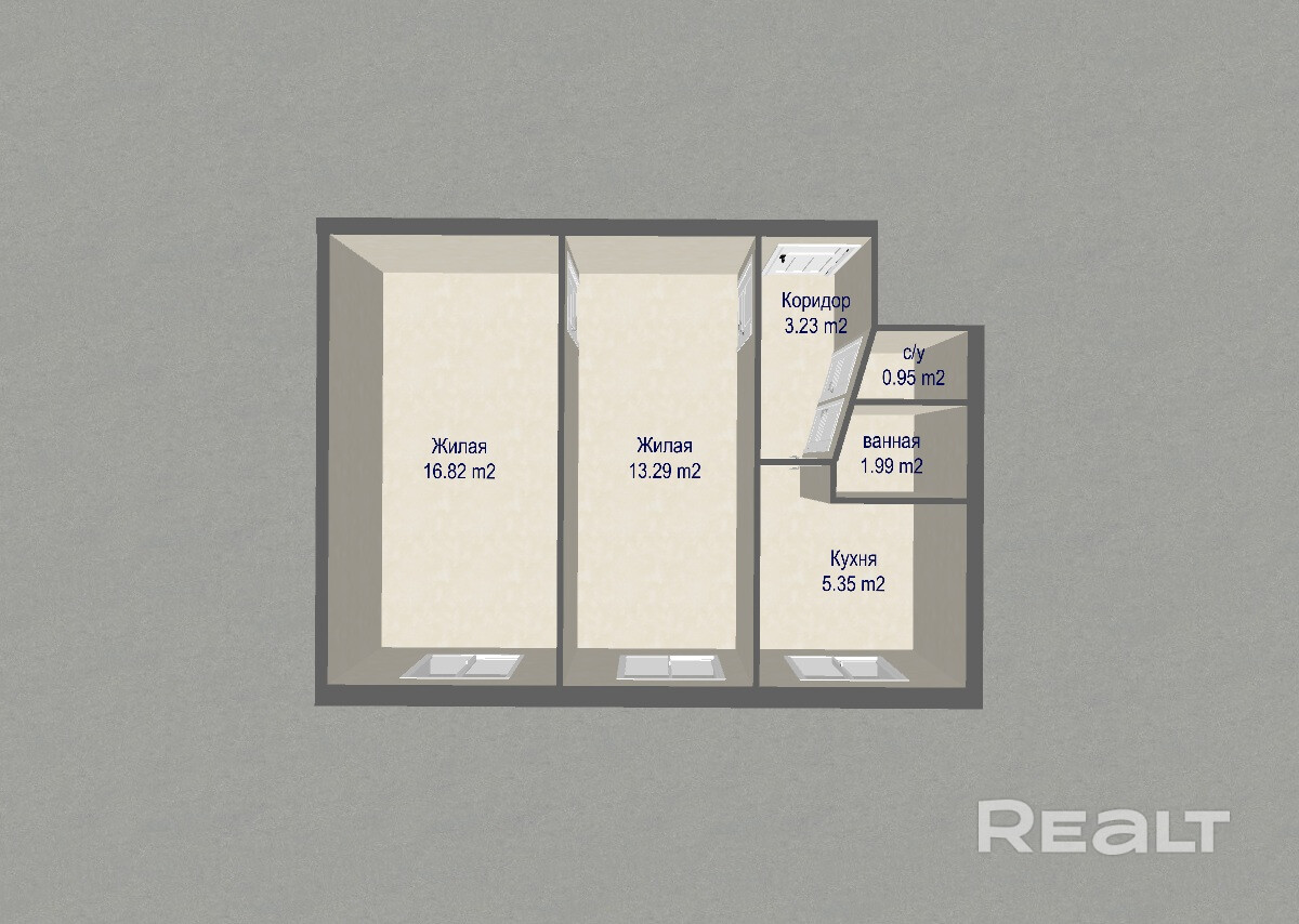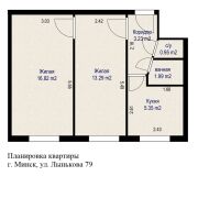 Общая площадь - 41.63м.кв., две изолированные комнаты - 16.82 м.кв и 13.29 м.кв.