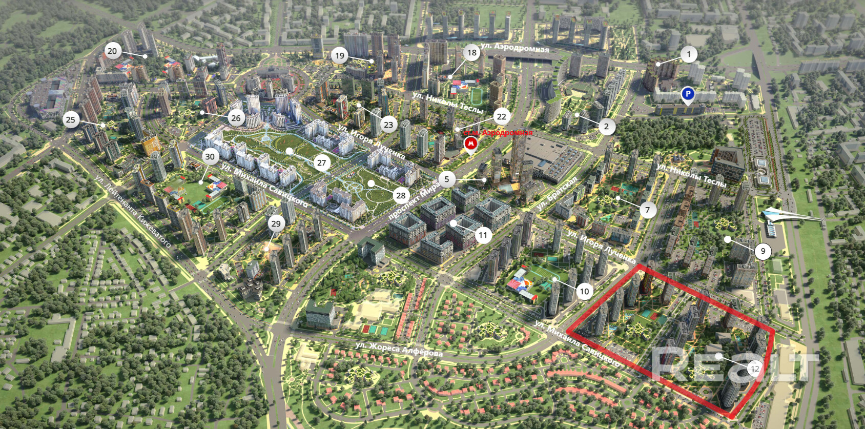 В квартале будут построены детский сад, школа и все необходимое для жизни. В шаговой доступности МФЦ и крупнейший ТЦ АВИА МОЛЛ.