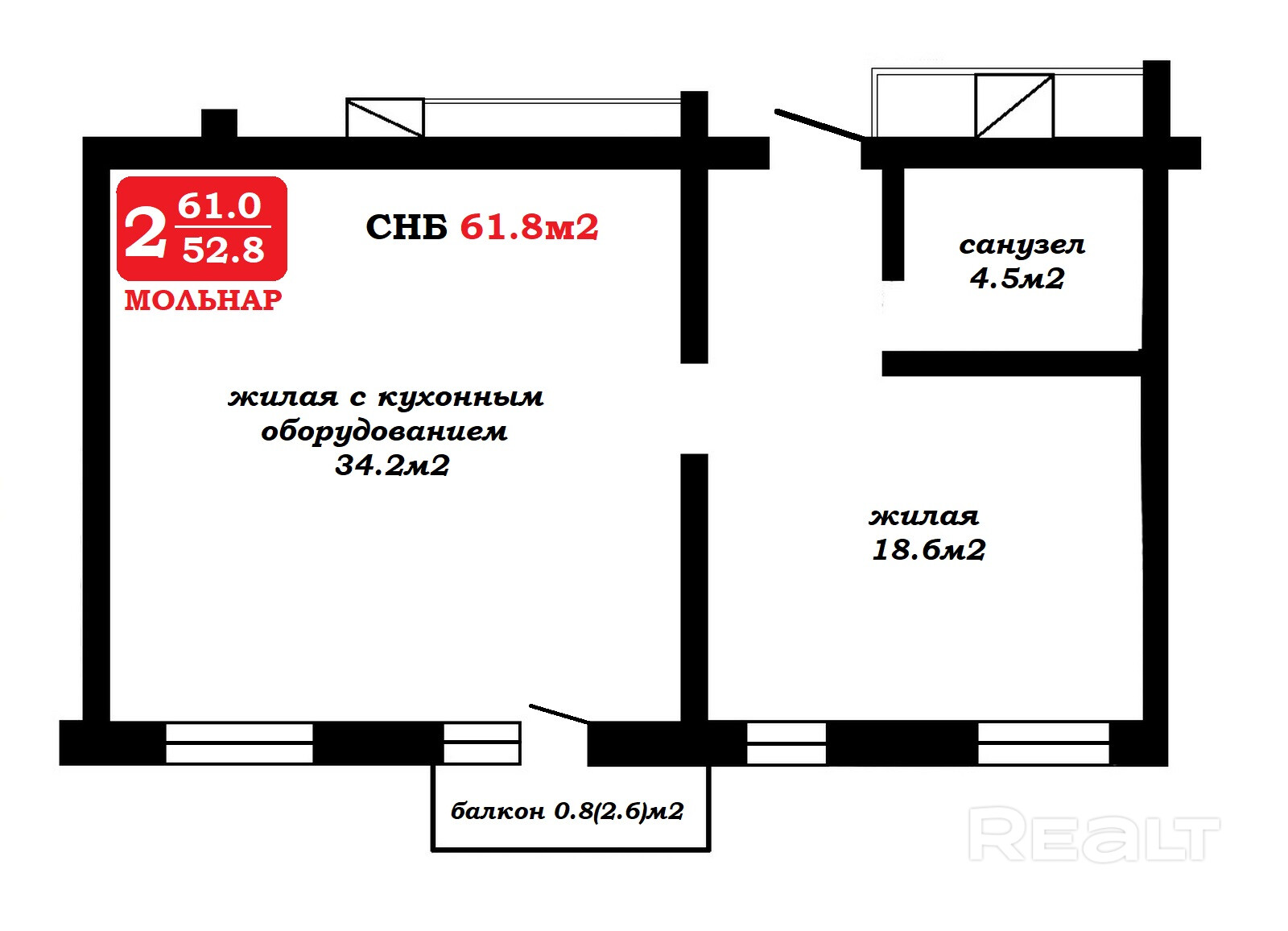 Площадь по СНБ — 61.8 м2