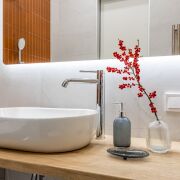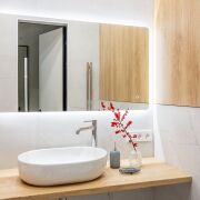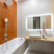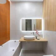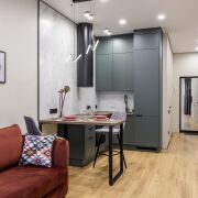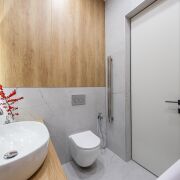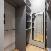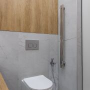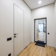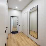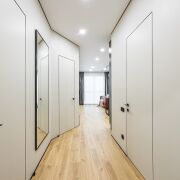 Интерьер выполнен с вниманием к деталям и без компромиссов по качеству: стены под покраску, скрытые двери высотой 2,30 м, керамогранит и премиальный ламинат Egger создают чистую, современную эстетику.