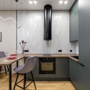 Продуманное освещение подчёркивает архитектуру пространства, а кухня с мощной островной вытяжкой сразу выдаёт уровень квартиры.