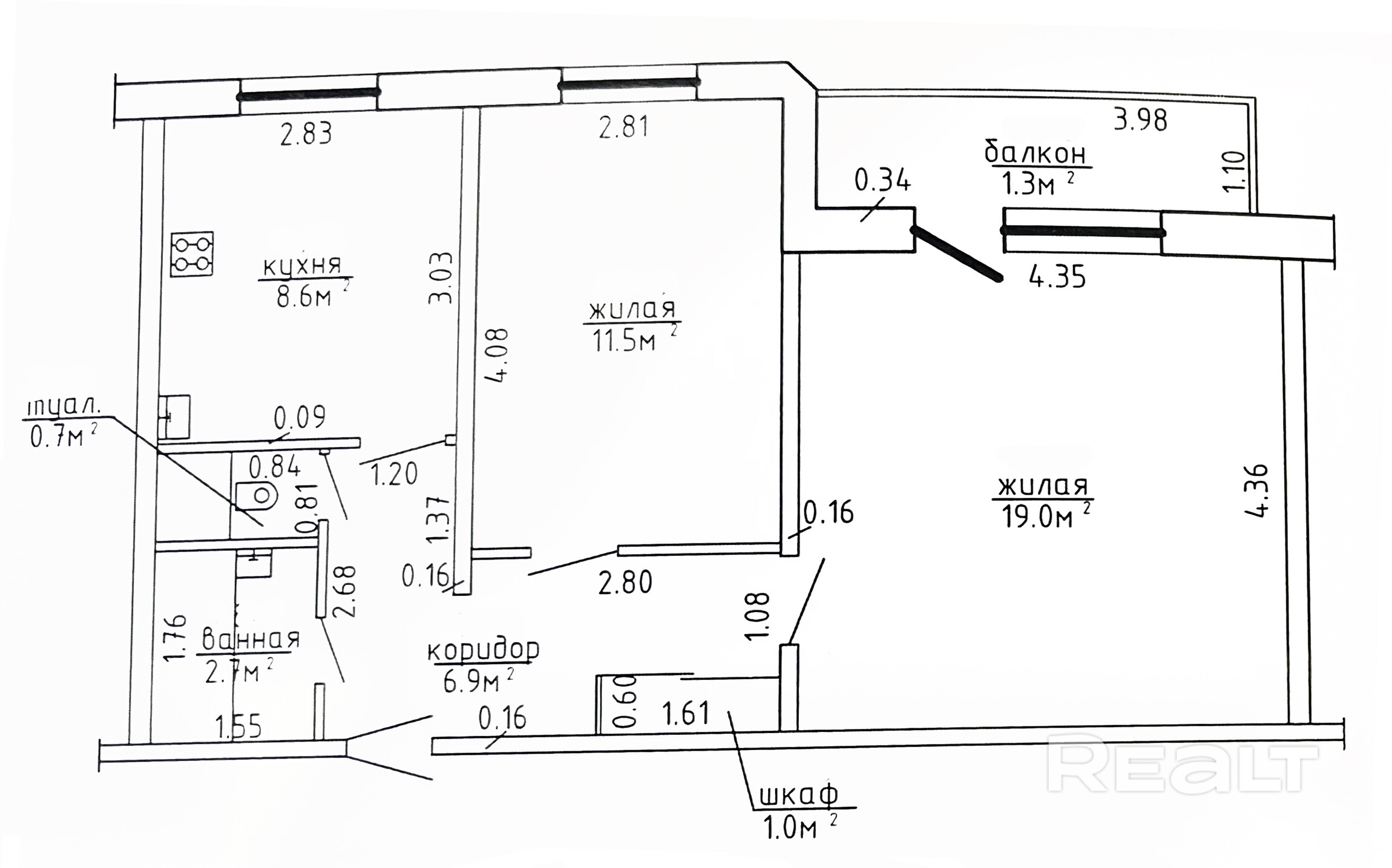 Описание квартиры: квартира в хорошем состоянии, находится на 3 этаже 5-ти этажного панельного дома, 1991 г.п., общая площадь 50.4 кв.м, жилая 30.5 кв. м. (две жилые раздельные комнаты 19 и 11.5 кв.м), большая кухня 8.6 кв.м. Входная дверь металлическая, межкомнатные деревянные, пол – линолеум, плитка на кухне, окна из профиля ПВХ, раздельный санузел, облицован плиткой, лоджия утеплена, установлены окна из профиля ПВХ. В квартире вмонтированы шкафы-купе.