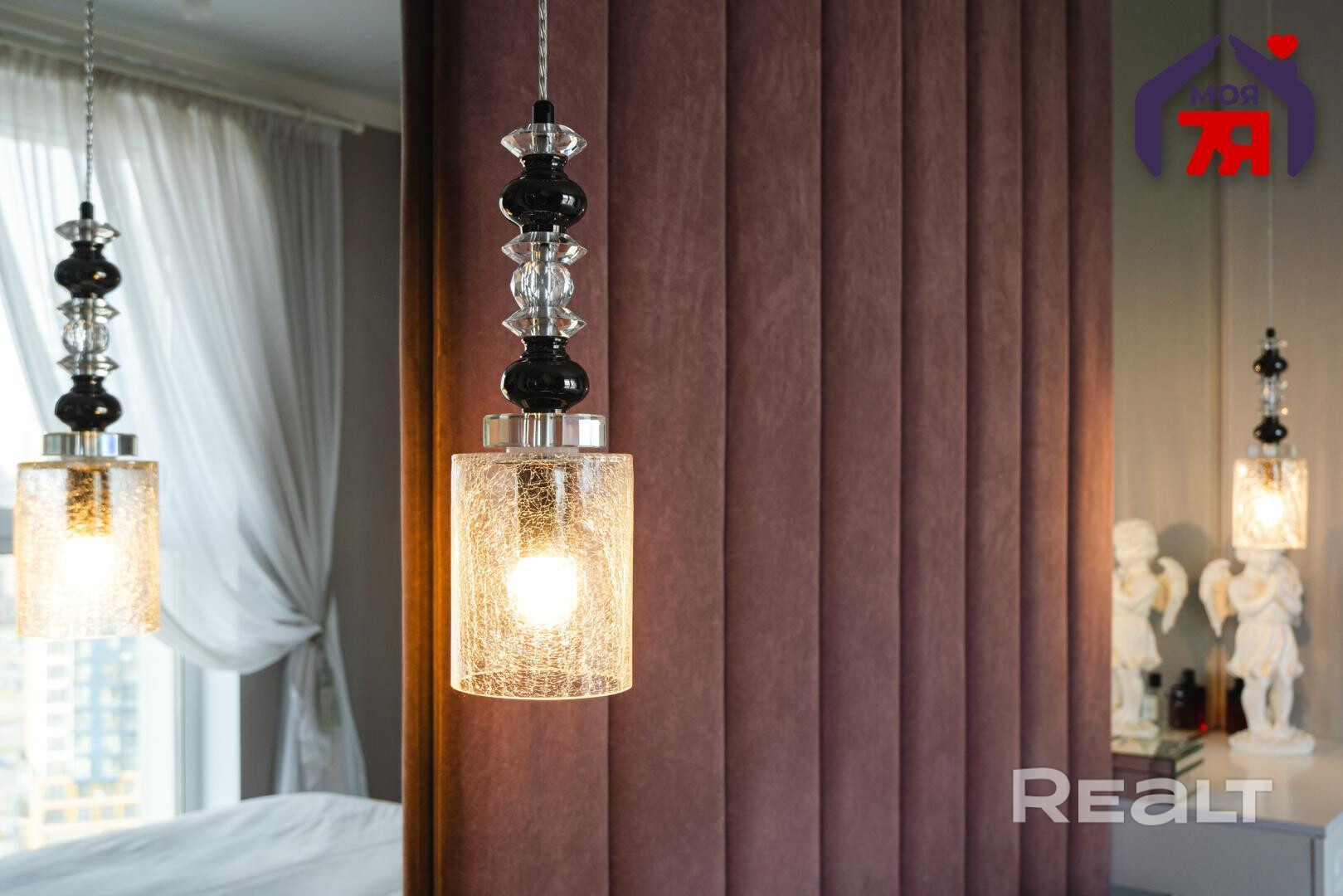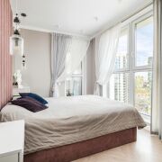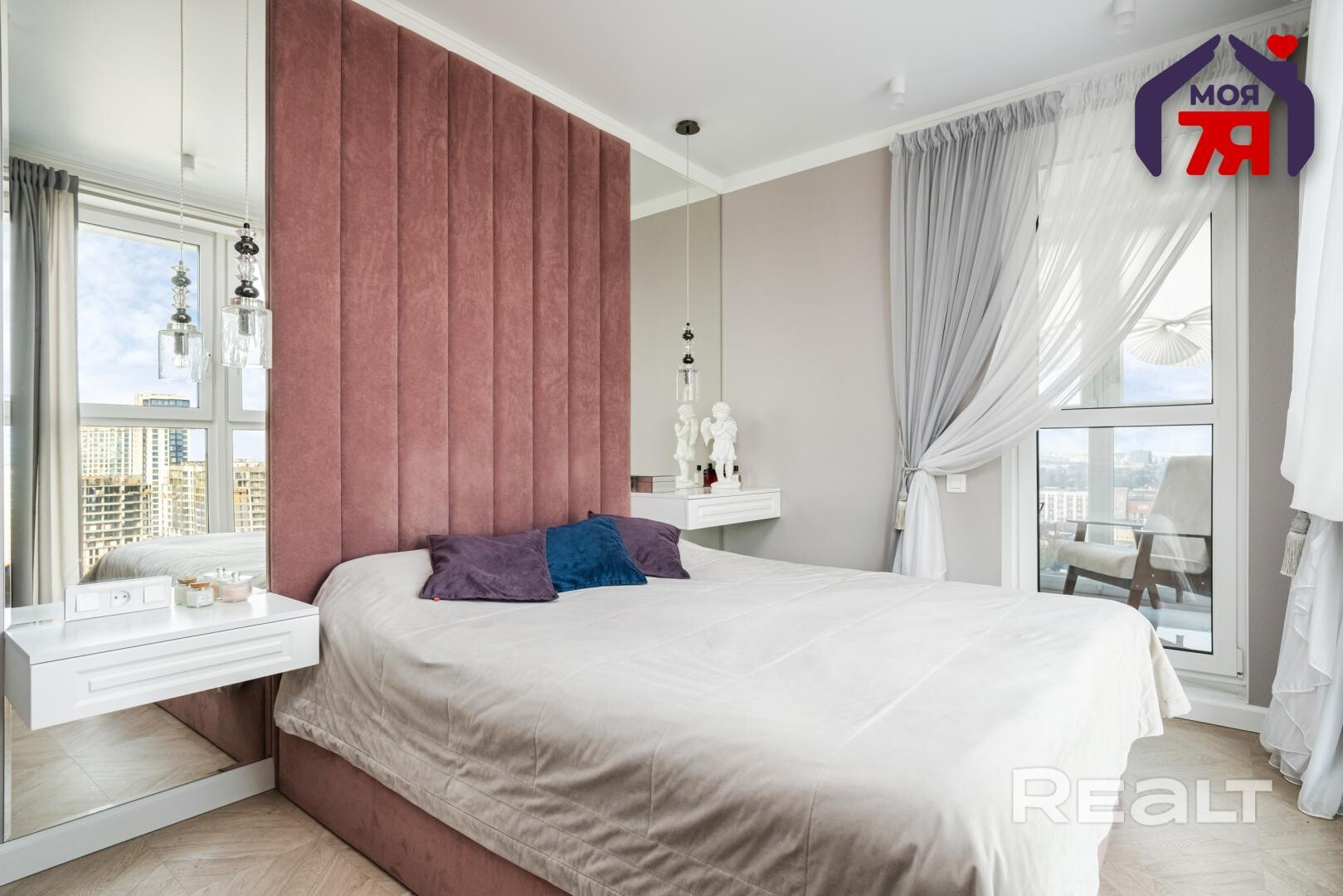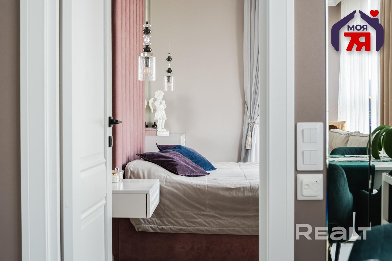 - Основная спальня также продумана до мелочей: паркетная доска на полу, норвежские обои и зеркала на стенах, натяжной потолок. Вся мебель, включая кровать и шкаф-купе с крашеными фасадами, изготовлена на заказ и остаётся новому владельцу.
