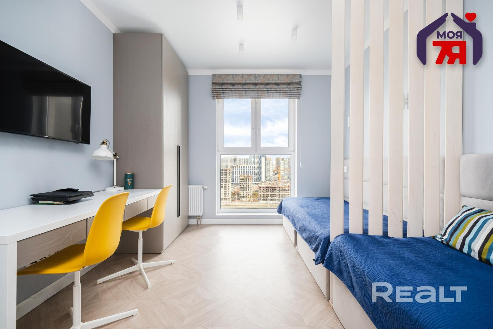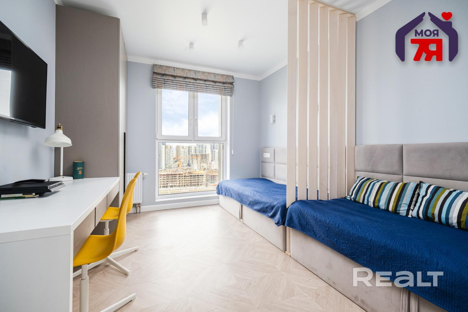 - Детская спальня оформлена в спокойных тонах: на полу паркетная доска, стены - норвежские обои. Встроенная система хранения, перегородка из массива дерева, кровати-диваны выполнены под заказ. Светильники "Novodvorski" создают мягкое, уютное освещение. Вся мебель остается.