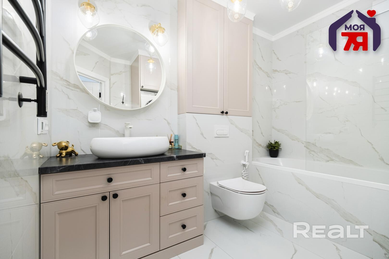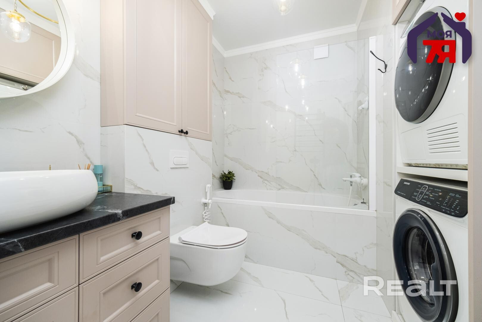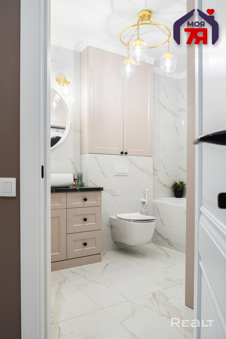- Ванная комната оформлена в светлых тонах: на стенах и полу - крупноформатный итальянский керамогранит 120×60. Установлена акриловая ванна, смесители Roca, душевая система, биде, стиральная и сушильная машины, бойлер, электрический полотенцесушитель и тёплые полы. Мебель с крашеными фасадами, фурнитура премиум-класса.