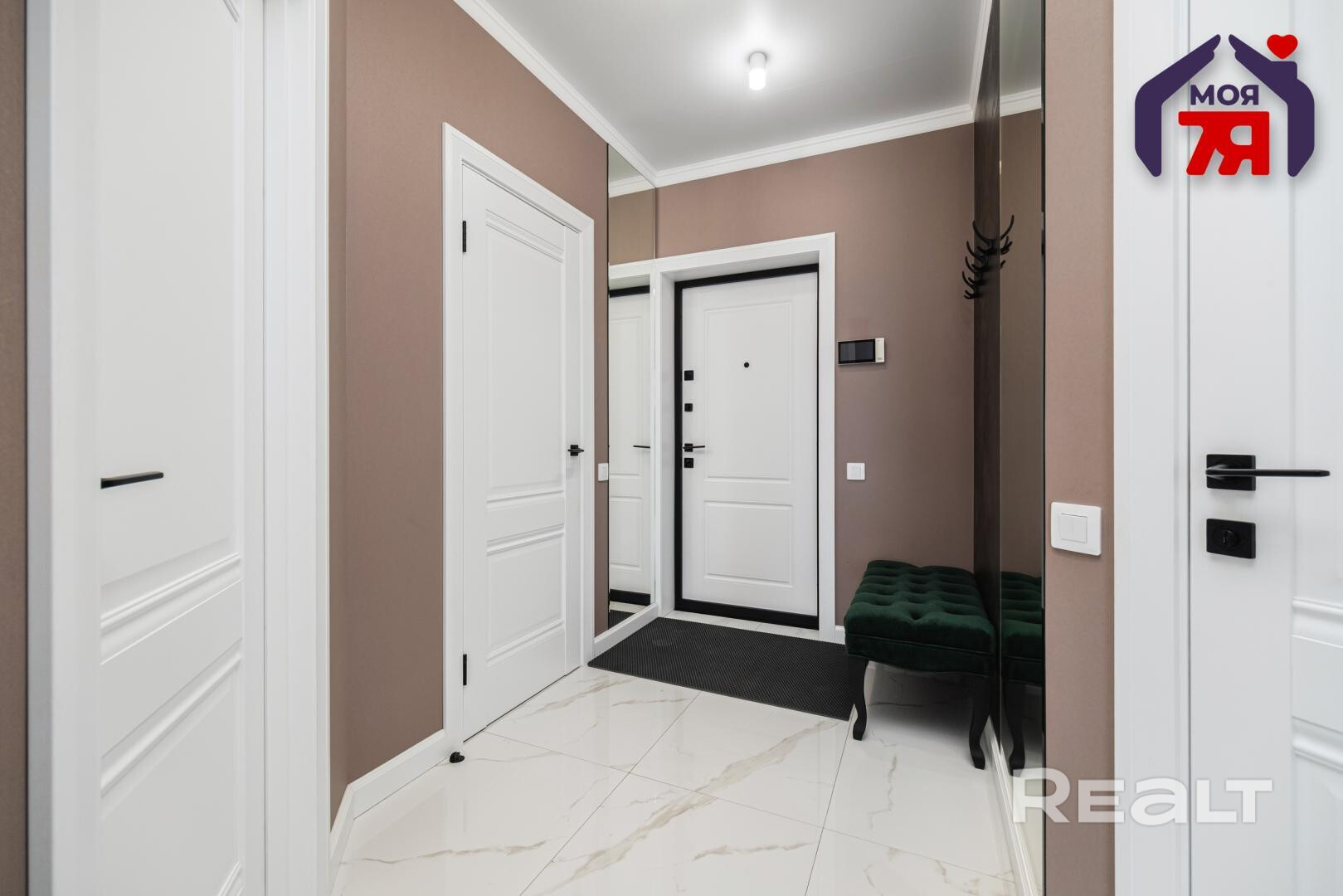 - Квартира спроектирована с учетом максимального удобства и гармонии пространства. Прихожая оформлена в светлых тонах: на полу - итальянская плитка формата 120×60, стены украшены зеркалами и декоративным керамогранитом, потолок натяжной. Здесь же находится вместительная гардеробная площадью 5 м2.