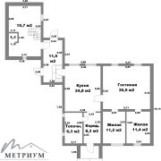 На первом этаже расположилась большая кухня (25м.кв) с двумя входами, большая гостиная, спальня с выделенным гардеробом и санузел с топочной. На втором этаже свободная планировка, где может разместиться 3-4 жилые комнаты.