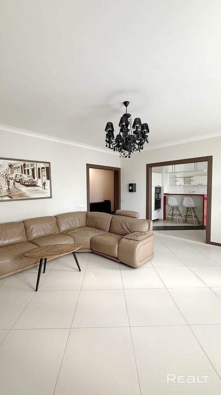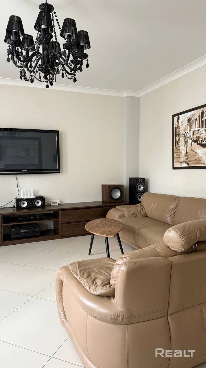 - Гостиная — территория уюта и больших компаний. 🛋️ Просторная, светлая, с удобнейшим кожаным диваном, который так и шепчет: «Бросай всё, у нас марафон «Властелина колец» 🍿🎬. Эффектная черная люстра добавит драматизма вашим вечерам. 🎭