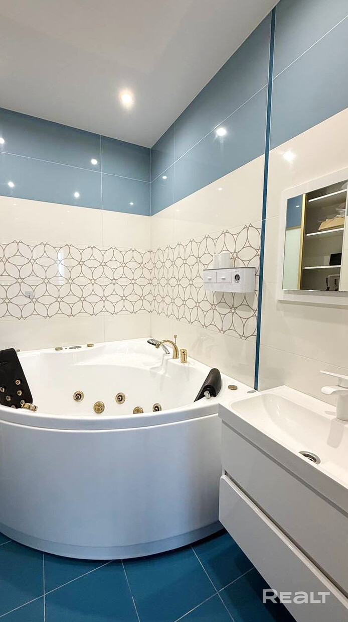 - Царство №1: Ваш личный SPA-салон. 👑 Угловая джакузи с гидромассажем, где можно смыть с себя не только усталость, но и экзистенциальные вопросы бытия. Золотистая фурнитура добавляет ровно столько шика, чтобы почувствовать себя королевской особой. 🛀