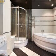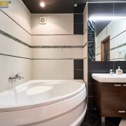 Санузел облицован импортным кафелем. Установлена угловая акриловая ванна, душевая кабина, умывальник с тумбой с местами хранения.