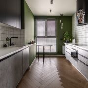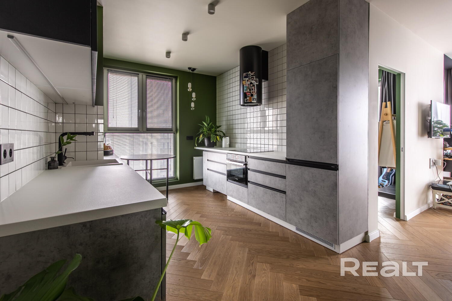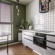 Просторная кухня оборудована всей необходимой бытовой техникой: встроенный холодильник, стиральная машина с функцией сушки Haier, посудомоечная машина, стеклокерамическая варочная поверхность, духовой шкаф с функцией СВЧ, вытяжка – Maunfeld, фильтр для питьевой воды.