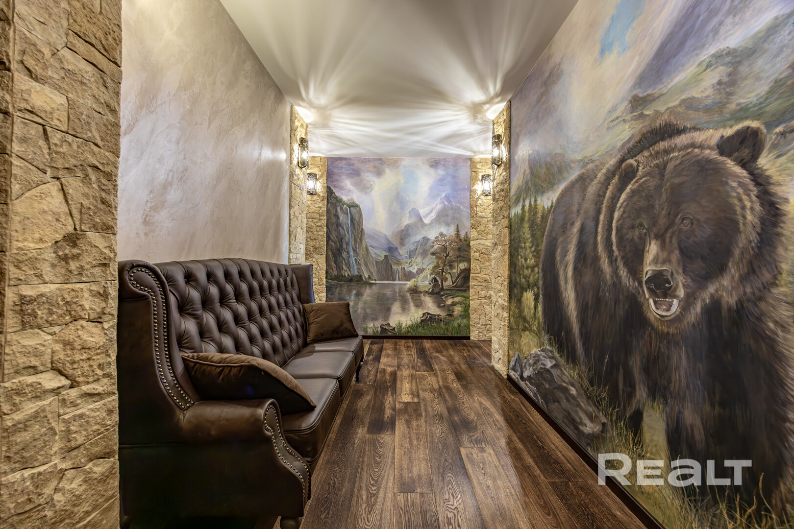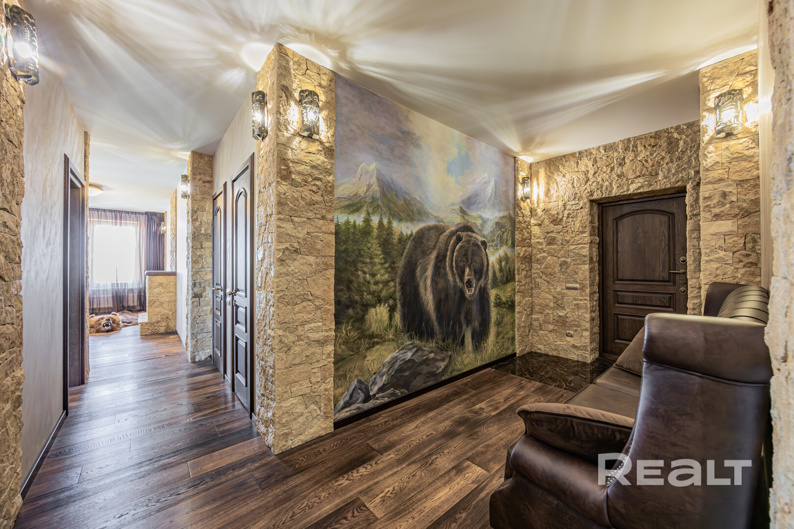 Уникальные детали: натуральный облицовочный камень доломит (Дагестан), репродукция картин французского художника, бронированное остекление лоджии, осветительные приборы ручной ковки (Австрия).