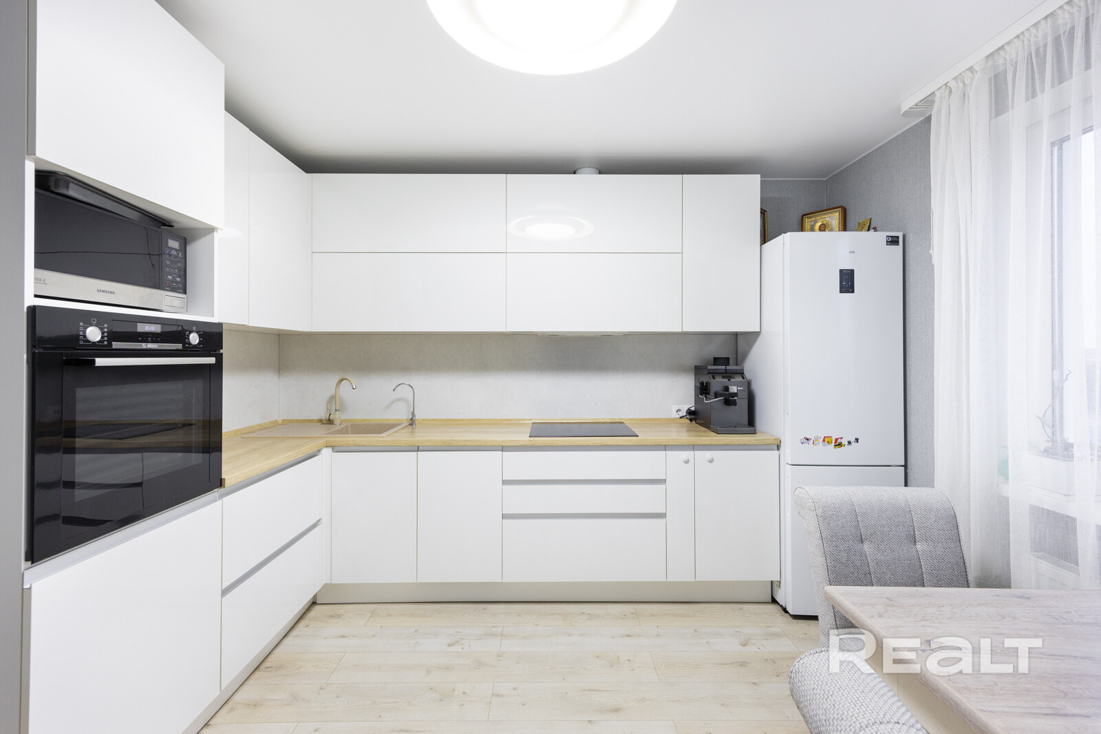 Имеется холодильник Samsung, посудомоечная машина Bosch, варочная панель Bosch, вытяжка Best, духовой шкаф Bosch, СВЧ Samsung, стиральная машина LG.