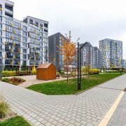 - Территория вокруг дома оборудована детскими и спортивными площадками, пешеходными дорожками и зелёными зонами. В вечернее время всё пространство освещено, что создаёт ощущение безопасности и комфорта.
