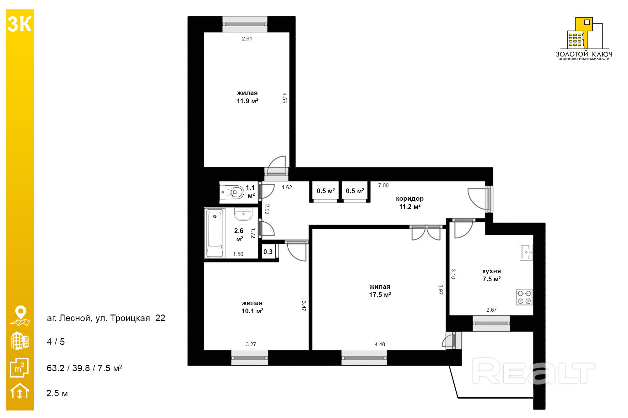 Три раздельные комнаты предлагают пространство для каждого члена семьи. Ориентация окон на восток и запад гарантирует естественное освещение в течение всего дня.