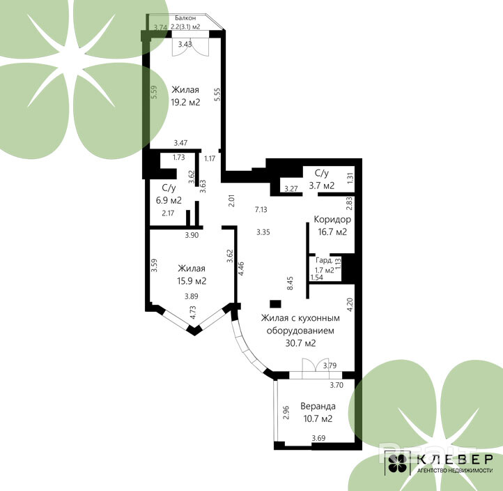 Комнаты – 30,7 м2, 19,2 м2 и 15,7 м2.