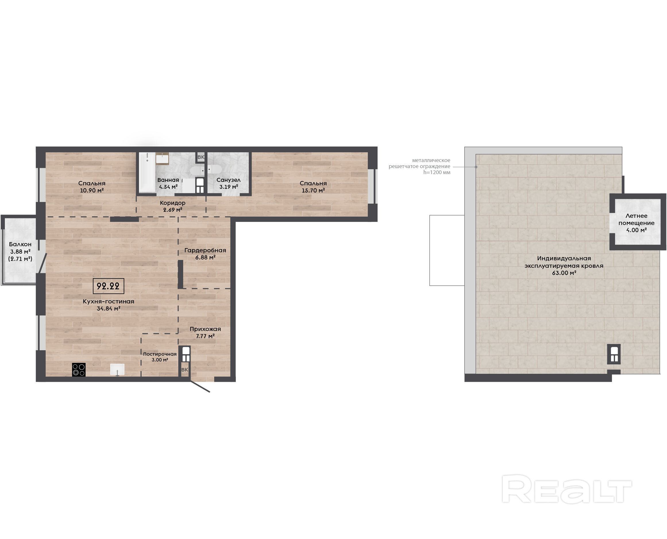 Просторная 3-комнатная квартира с террасой на крыше. Высокие потолки и большое количество естественного света создают ощущение простора и уюта.