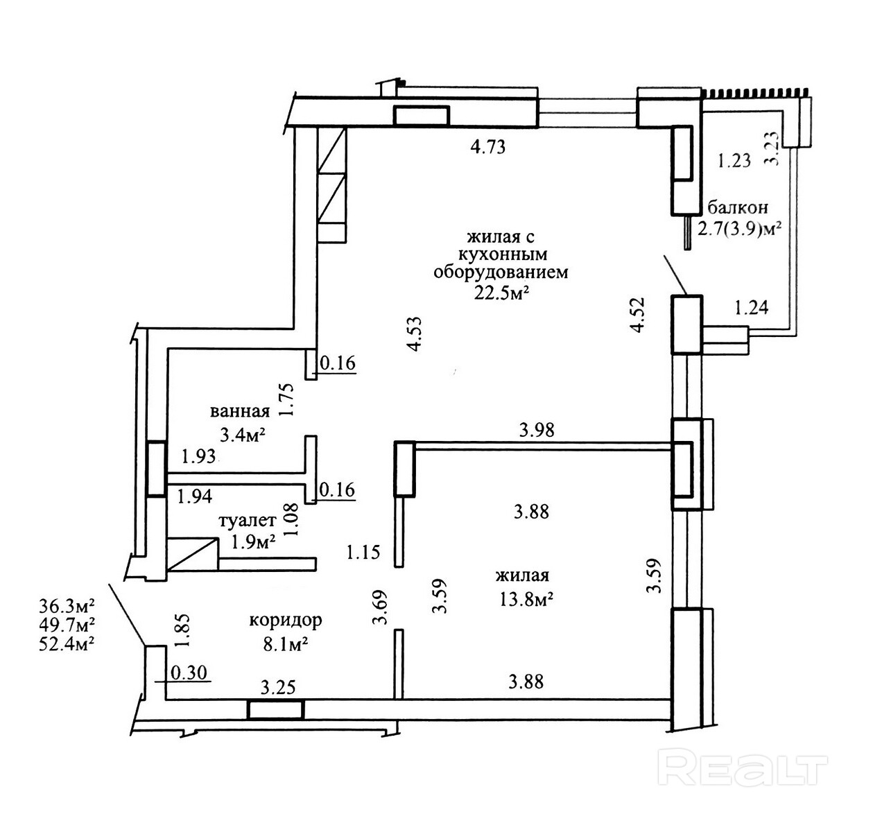 - Площадь по СНБ 52,4 м2 Общая площадь 50,1 м2