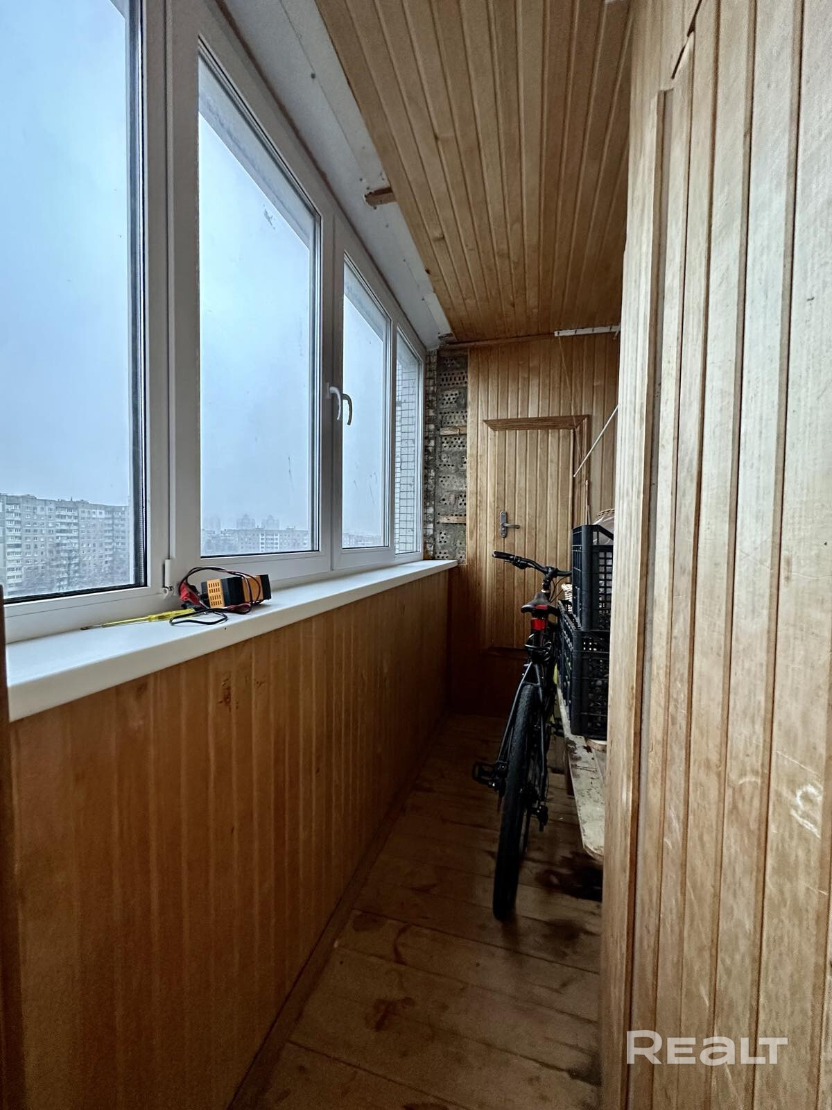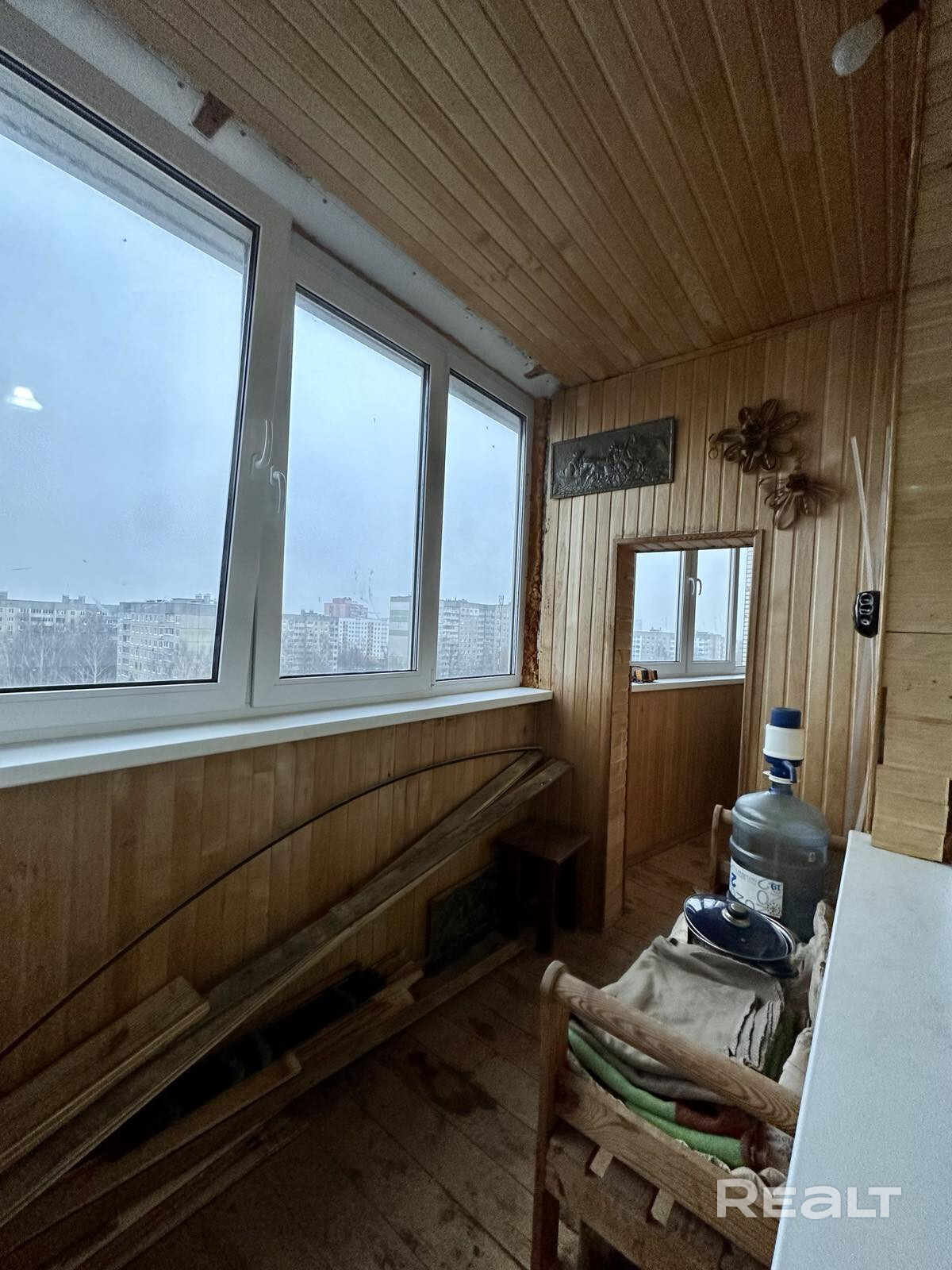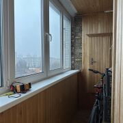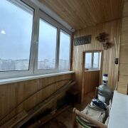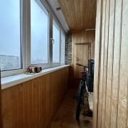 - Выход на балкон из жилой комнаты. Просторная лоджия площадью 5.1 кВ.м. застеклена, отделка вагонка.