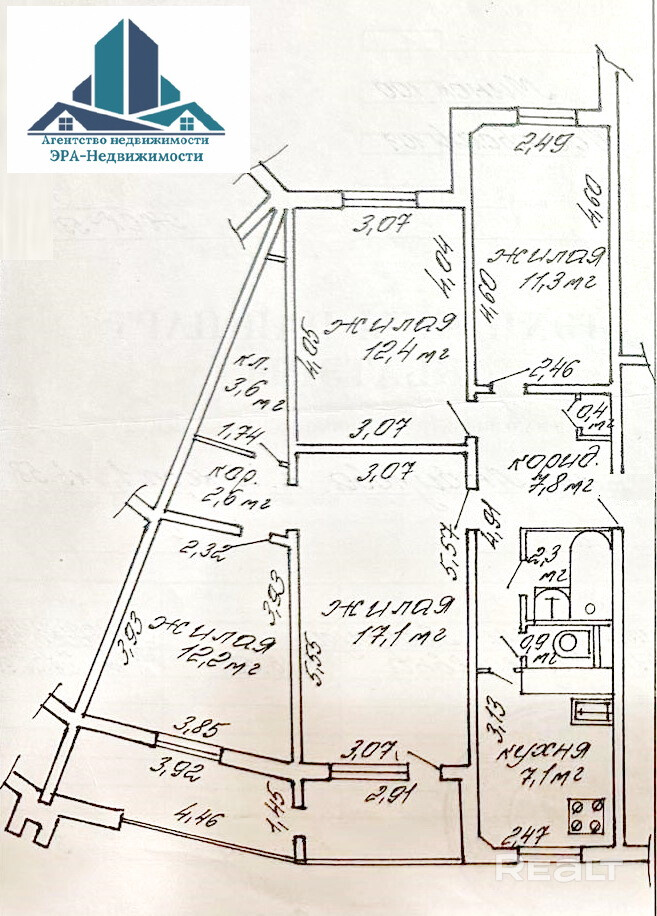 4 жилые комнаты: одна из них проходная площадью 17.1 кв.м., изолированные комнаты площадью 12.4 кв.м., 11.3 кв.м., 12.2 кв.м.,