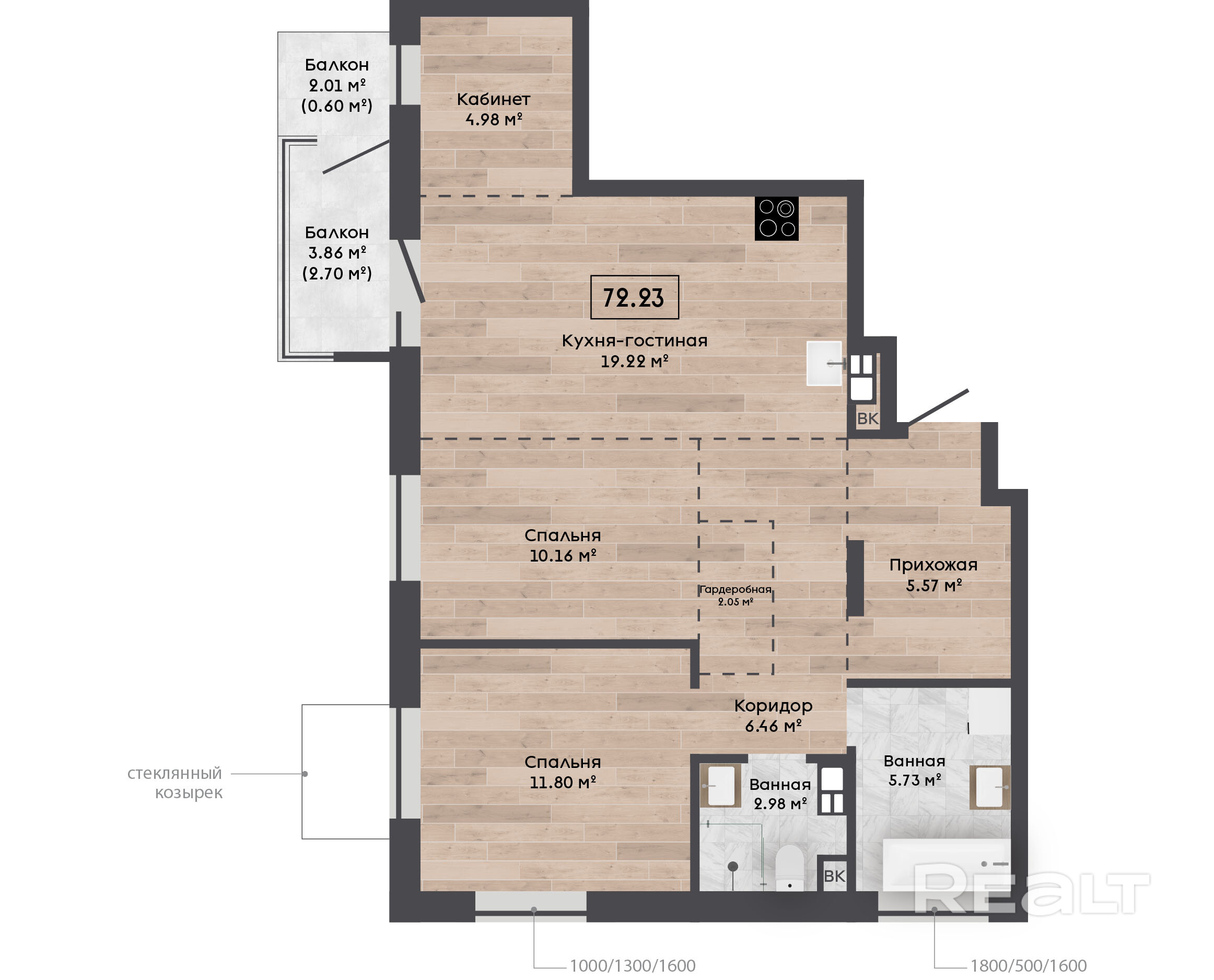 - Открытые и остеклённые балконы.
