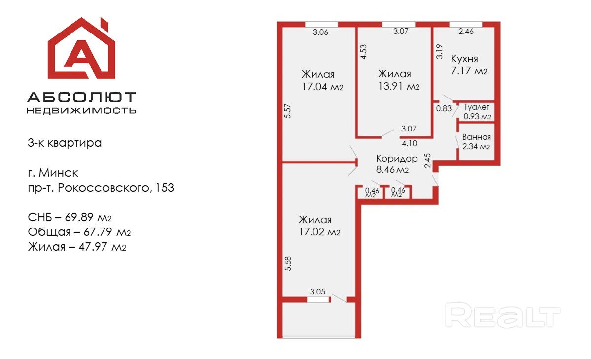 Площадь общая по СНБ 69.89 / жилая 47.97 / кухня 7.17 кв.м. Высота потолков - 2.54 м, 9 этаж.