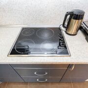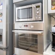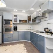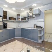 Уютная кухня 10,6м2. Установлена встроенная кухня с бытовой техникой: варочная панель, вытяжка, духовой шкаф, микроволновая печь.