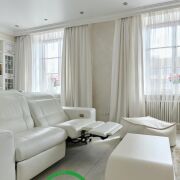 В интерьере использовались качественные импортные материалы: паркет из дуба GARBELOTTO (Италия), плитка IMOLA (Италия), немецкая премиальная сантехника, вся мебель изготовлена под заказ из Европы (диван-реклайнер из натуральной кожи высочайшего качества Cattelan Italia), мебель из массива дуба, отделка золотом в ванной комнате (зеркало и мазаика), кристаллы Swarovski. На стенах венецианская штукатурка (Италия). Электрокамин с увлажнителем воздуха. Подогрев пола, кондиционеры, видеонаблюдение.
