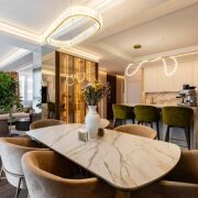 Кухня оснащена современной техникой от ведущих производителей: духовой шкаф, варочная панель и микроволновая печь Siemens, посудомоечная машина Bosch, холодильник и морозильная камера Liebherr. В ванных комнатах установлена сантехника Hansgrohe и Villeroy & Boch, а также керамогранит премиум-класса.