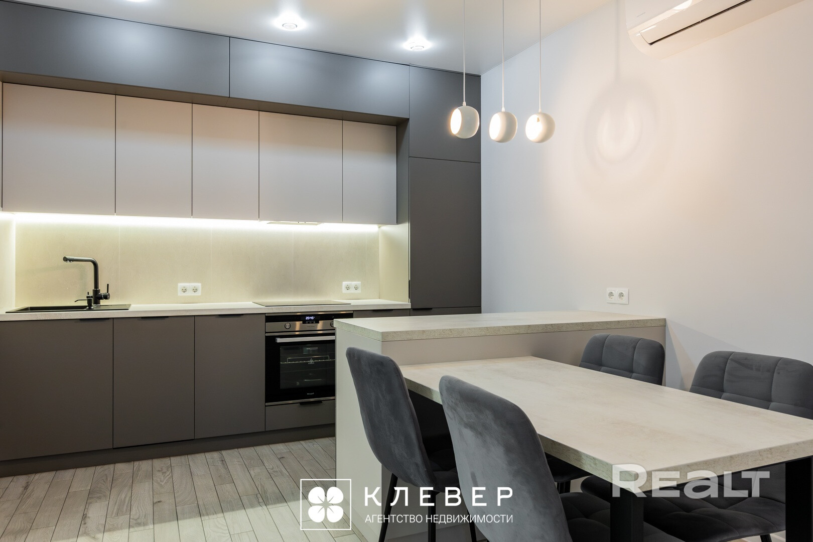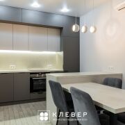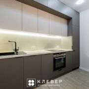 - кухня-гостиная: встроенный кухонный гарнитур с фасадами «Egger» и фурнитурой «Blum». Встроенная техника «Weissgauff» (варочная поверхность, духовой шкаф), «Maunfeld» (вытяжка, встроенные холодильник), посудомоечная машина «Exiteq», «остров» с системой хранения
